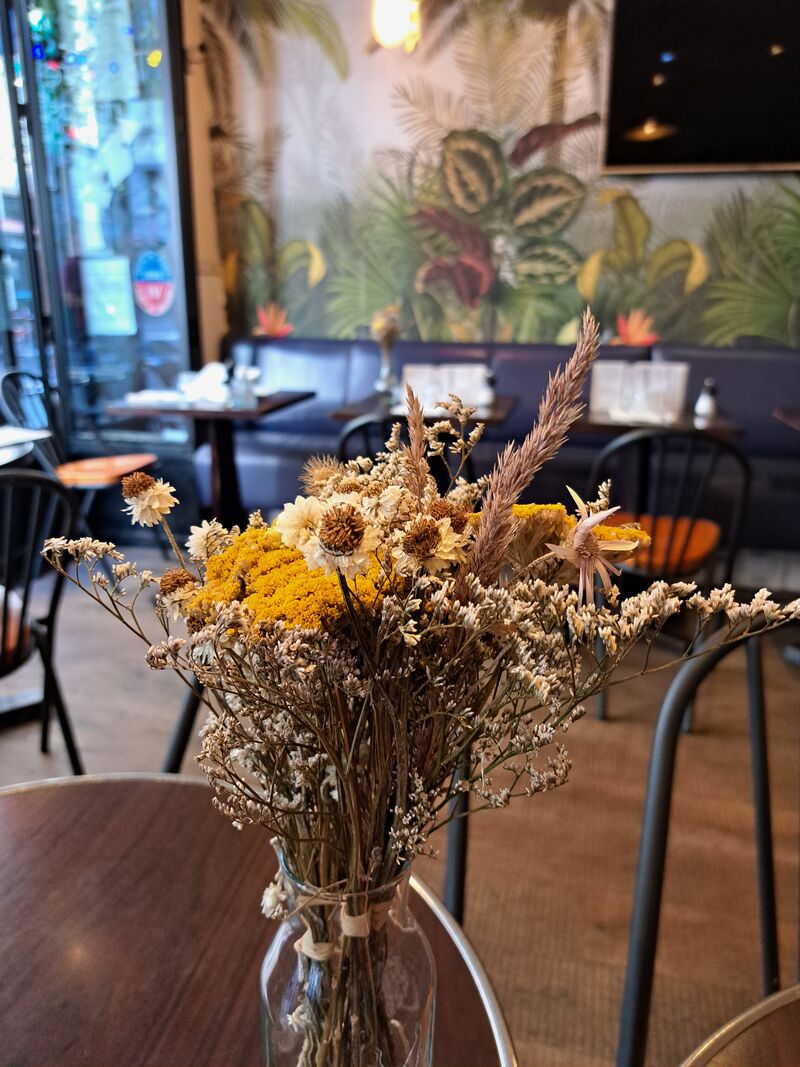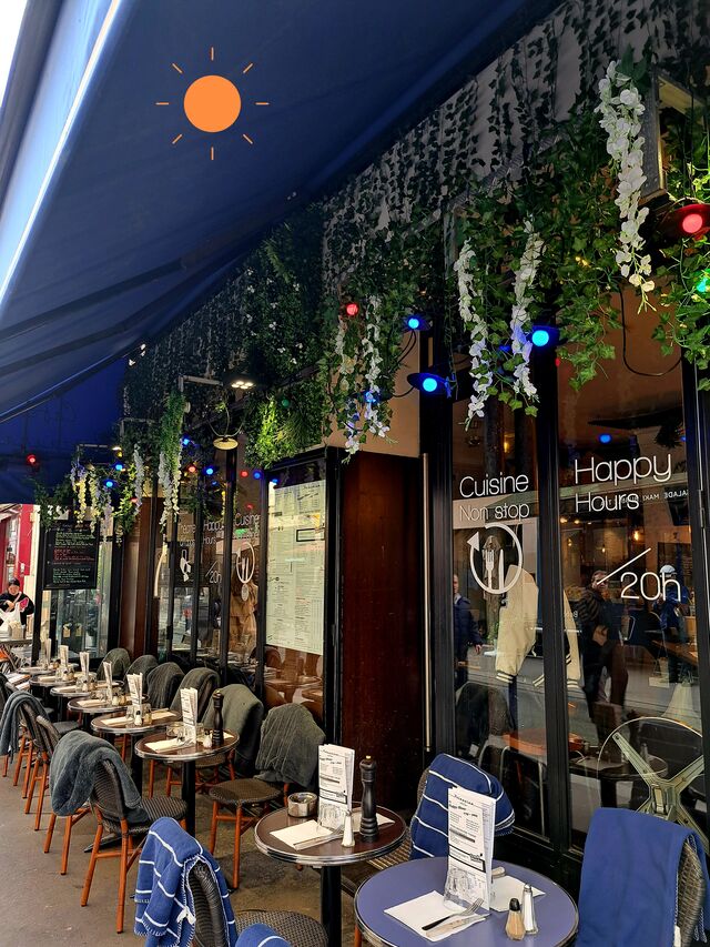 Dans un cadre fleuri, nous proposons un service non stop, une cuisine a base de produits frais, une formule déjeuner, des plats de saison grillades ou poisson, des burgers et grandes salades et quelques tapas et assiettes a partager pour l'apéritif. Venez nous découvrir lors de votre shopping dans les grands magasins, ou a l'occasion d'une soirée au théâtre Mogador. La terrasse est ouverte toute l'année, des plaids sont proposées l'hiver.